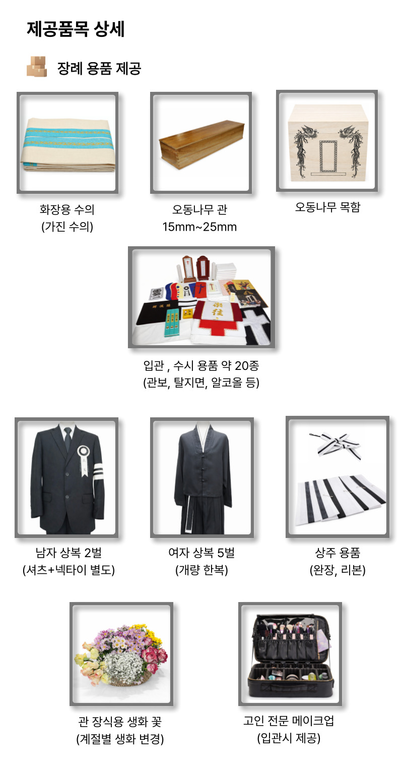 | 상주용품 | 상주리본, 완장, 머리핀 등 일체 | 제공 |